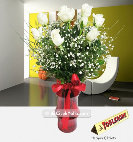 KIRMIZI NAPOLİ VAZODA 9 AD BEYAZ GÜL